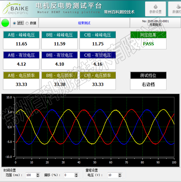 BK-TM900-Ⅱ 反電動(dòng)勢(shì)測(cè)試系統(tǒng),將被試電機(jī)拖動(dòng)至規(guī)定的轉(zhuǎn)速,由反電動(dòng)勢(shì)測(cè)試系統(tǒng)采集反電動(dòng)勢(shì)的波形,精準(zhǔn)測(cè)試反電動(dòng)勢(shì)的峰峰電壓、有效電壓、頻率、相位等參數(shù),從而驗(yàn)證設(shè)計(jì)產(chǎn)品是否滿足技術(shù)要求。